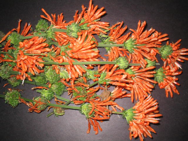 Leonotis Leonurus, better known as Wild Dagga or Lion’s Tail , is perhaps the best known of several sedating medicinal plants in the same family.  Wild dagga is sometimes mistaken for its common cousin, leonotis nepetifollia, aka klip dagga.  While both species have similar flower clusters displaying silky bright orange petals, and they both contain the active compound, leonurine,  there are several fundamental differences that can be used to easily distinguish the two. Wild dagga has long slender leaves, whereas klip dagga has spade-shaped leaves with serrated edges. Klip dagga seed pods are composed of very sharp spikes that are not present in wild dagga pods. You can handle wild dagga pods much more easily. And although both have bright orange petals, those of klip dagga tend to be red-orange.  Both plants are used herbally for things like coughs, fever, stress relief and relaxation.  The pure orange petals are said to have the highest concentration of leonurine compared tot he rest of the plant.  Many people seem to think that klip dagga is the stronger of the two. However, when it comes to the whole dried flowers, wild dagga is far superior.   The leaves and pure petals of each of the two species is a bit more comparable. The seeds can sometimes take a bit to get started, but these plants usually grow like weeds once they are started. Even a single plant will provide plenty of foliage each year. Wild dagga is a bit more reluctant to flower in northern climates. It should be given good light and adequate root space. Once a plant is started, it becomes shrub-like, and the tender shoots can be used to propogate new plants relatively easily. Wild dagga is the type of flower that will stand out in a flower garden, and it is a staple to any ethnobotanical garden. WE ALSO OFFER KLIP DAGGA SEEDS & A VARIETY OF DAGGA PRODUCTS.